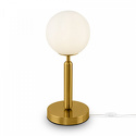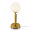 Настольная лампа декоративная стиля лофт для гостиной, кабинета или спальни имеет размеры 150x370 мм. Арматура светильника окрашена в латунный цвет. Лампы в комплекте - отсутствуют. В светильнике применяются лампы накаливания или светодиодная LED-лампа. Цвет плафонов - белый, с матовой поверхностью. Материал плафонов - стекло. Класс электробезопасности - II, степень пылевлагозащиты (IP) - 20. Максимальная мощность лампы (Вт) - 40. Светильник размещается на столе.