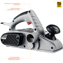 Строгание: 82 мм, глубина 2 мм • Двигатель: 750 Вт, 16000 об/мин • Пылеудаление: одностороннее • Вес: 3.25 кг